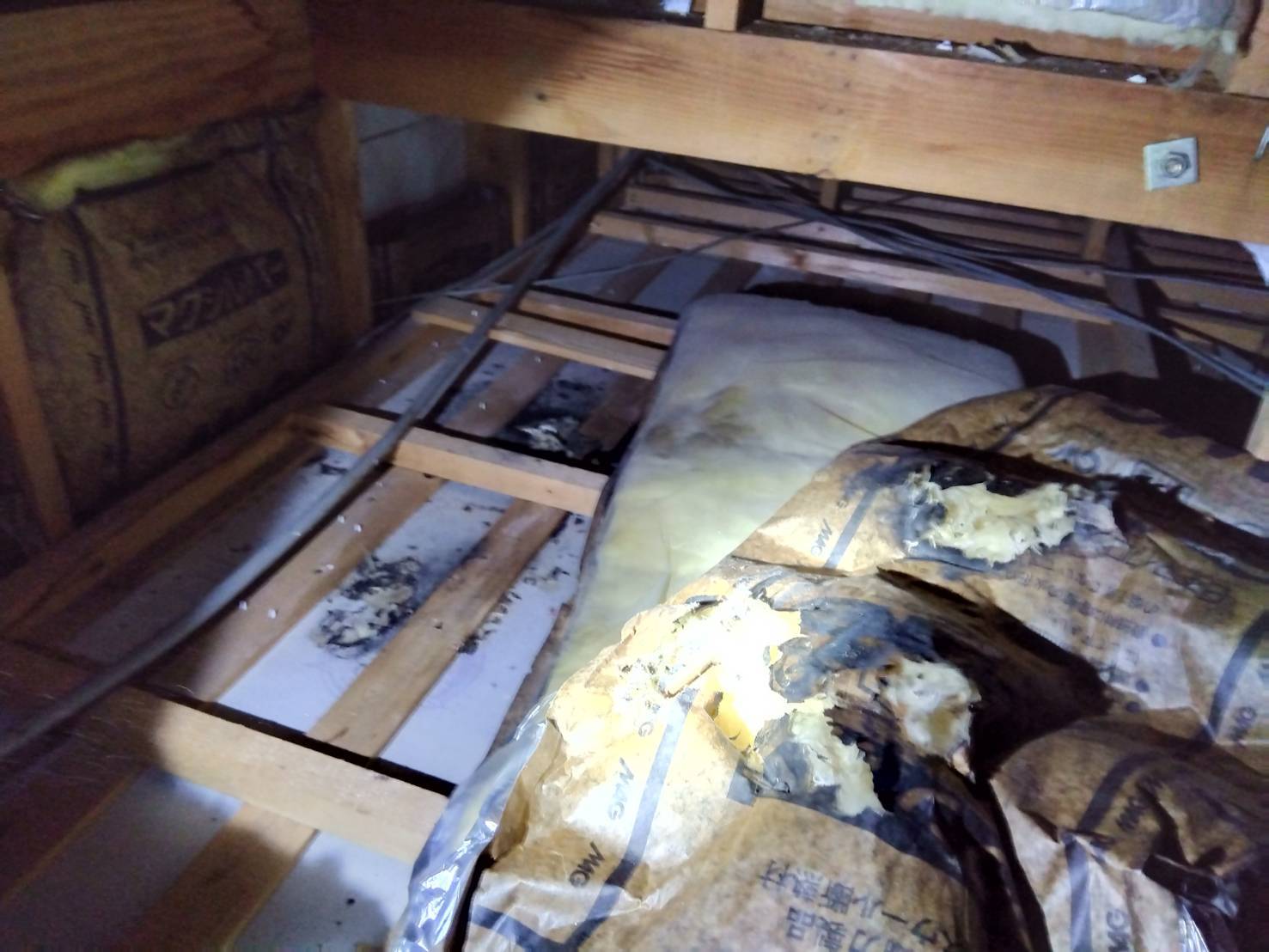 天井裏はこんな感じ・・・冬の間に暖を取りに侵入していたと思われます・・・。