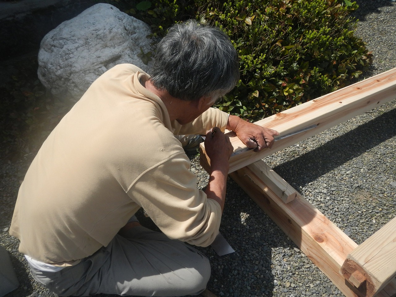また、外部では大工の岸棟梁が柱の加工をしています。