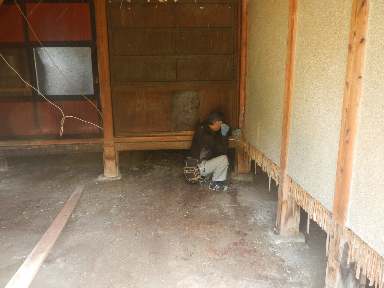 床解体後、新規床高さの墨出しをしています。