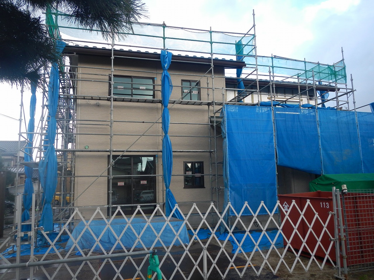 外部足場のシートも、休暇中に思わぬ強風で、近隣の皆様に