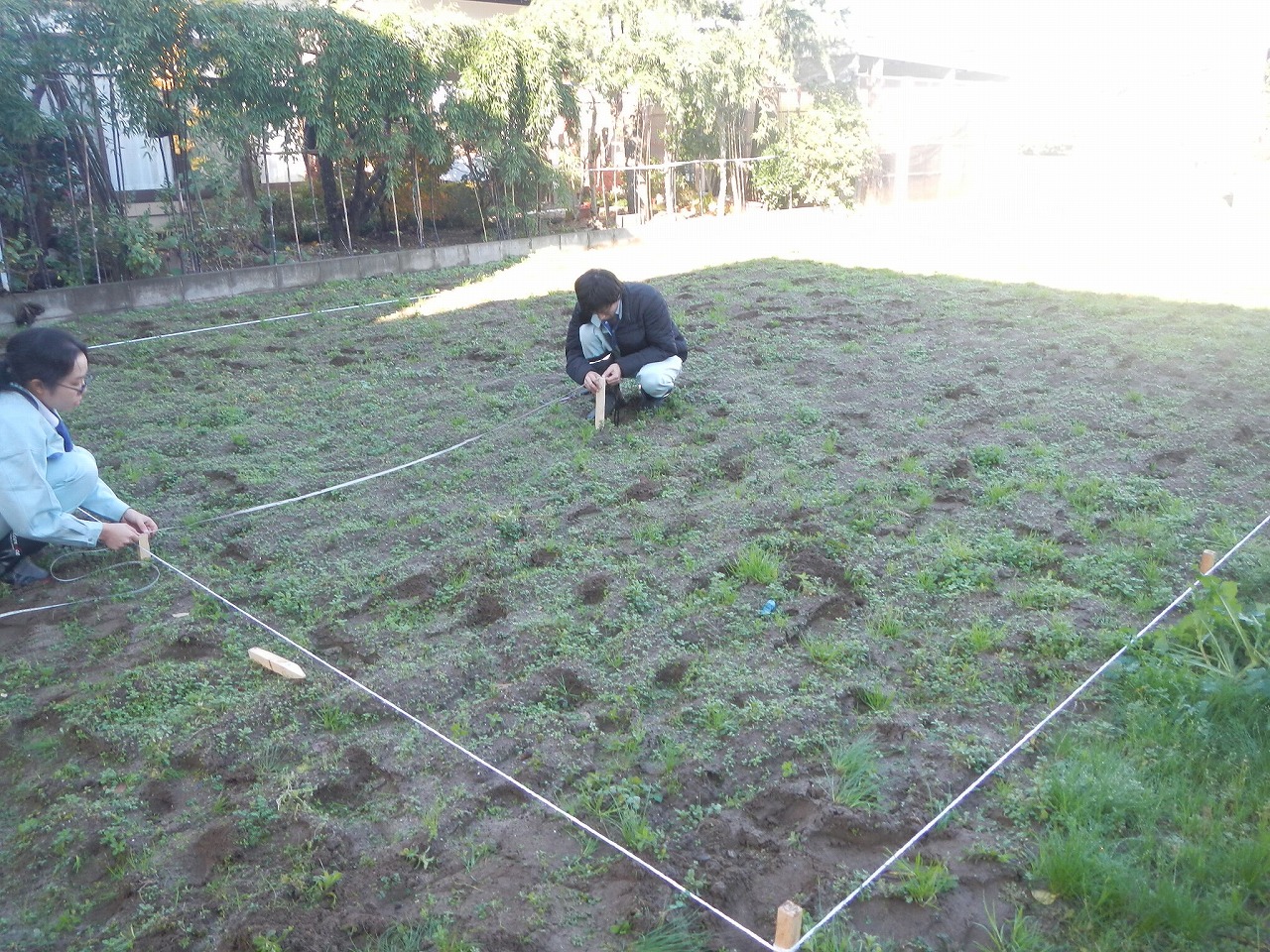 今日は、地盤調査のための、建物の位置出し(縄張り)を