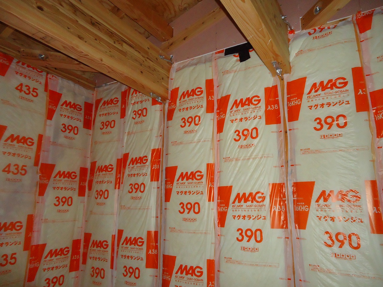 柱と柱、筋違いの間までしっかり、断熱材を入れます。