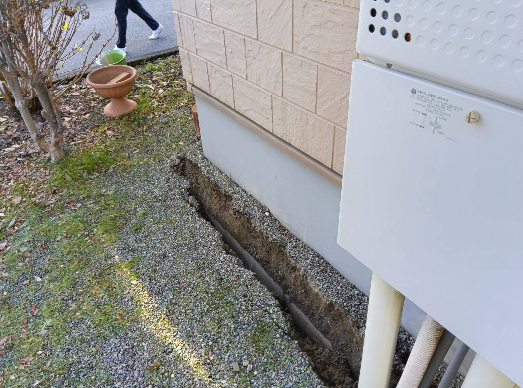 地震により液状化が起き地盤に段差ができ排水管が壊れている状態の写真です。