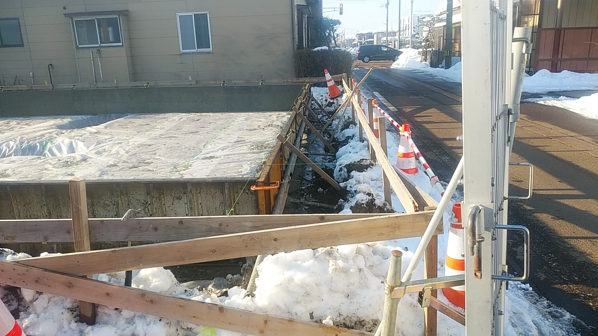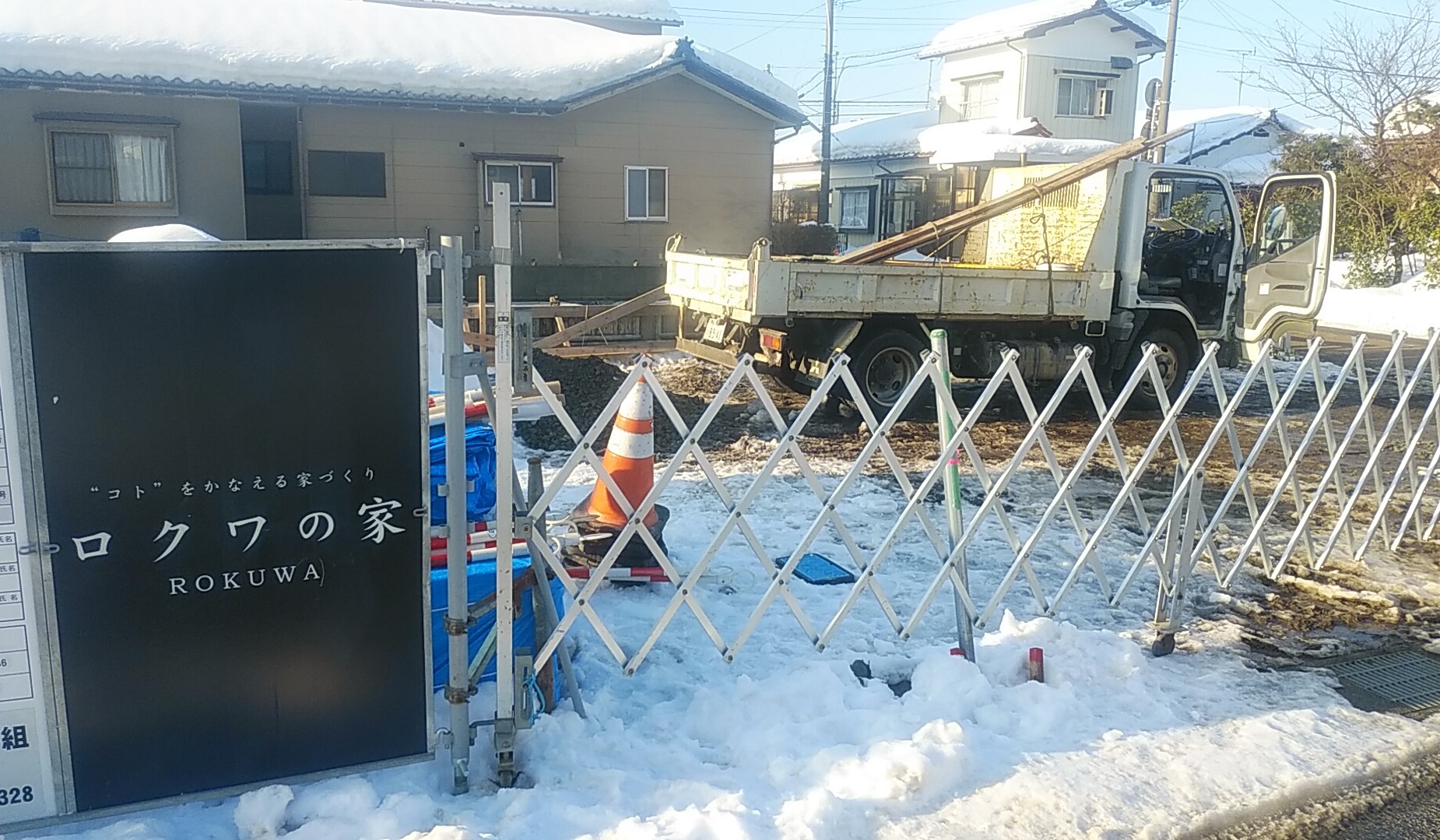 そんな中、弊社で建築中の現場も除雪をしながら、着々と進行しています。 雪も一段落、晴れ間の除く中、ただいま基礎工事中。
