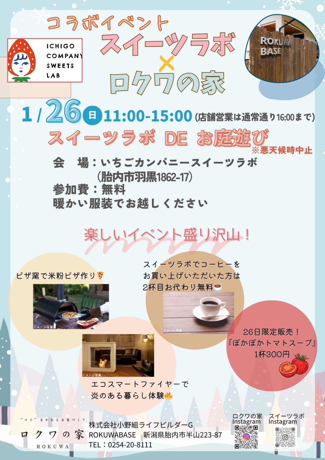せっかく積もった雪が融けてしまい雪遊びが危ういですが、お庭ではピザ釜KABUTOで浅野シェフお手製の米粉ピザの振る舞いや26日限定販売の“ぽかぽかトマトスープ”もご用意します!