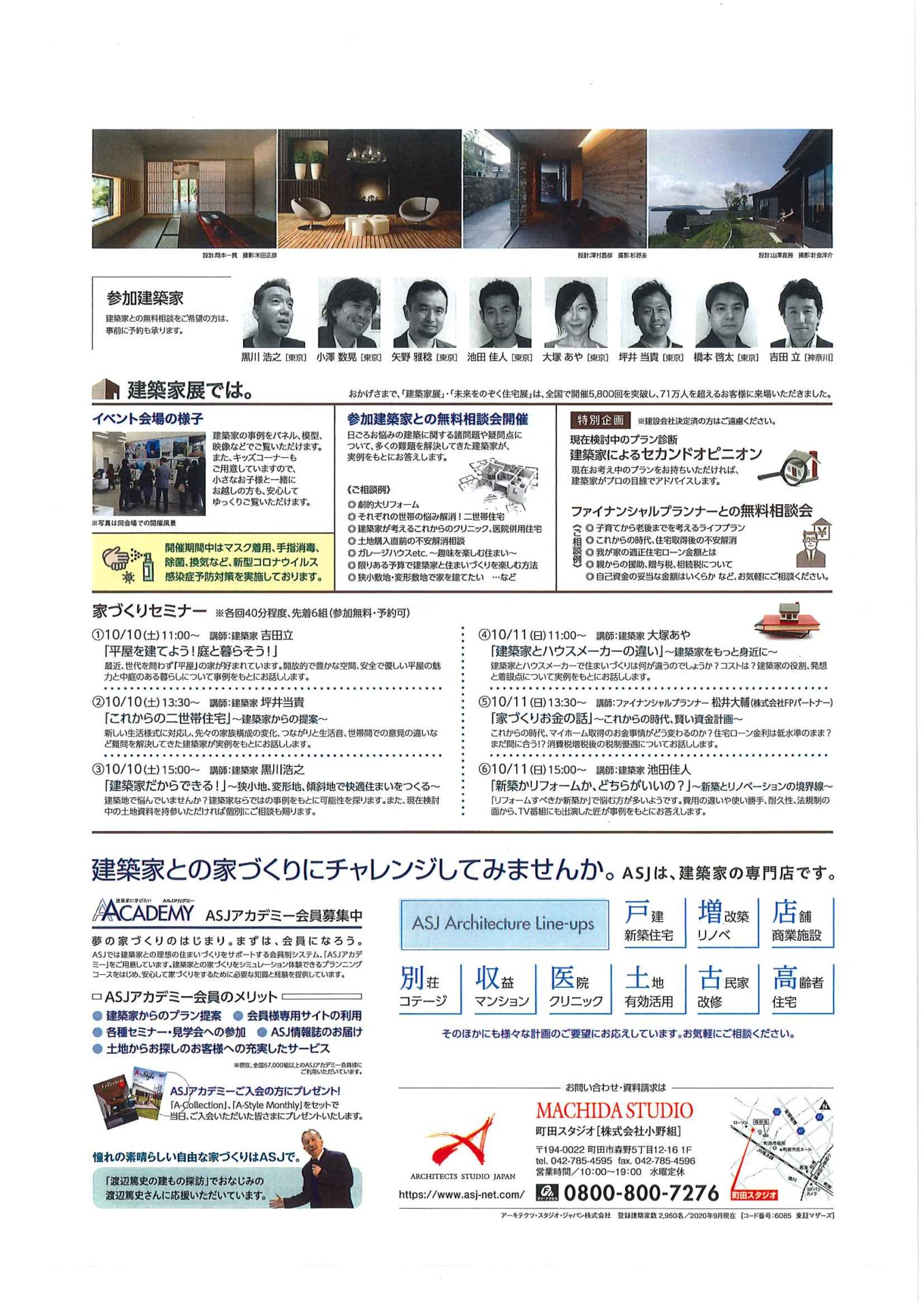 町田スタジオでは、コロナウィルス感染防止の為、「建築家展」のイベント開催を控えておりましたが、感染防止対策を行い「建築家展」のイベントを再開することとなりました。