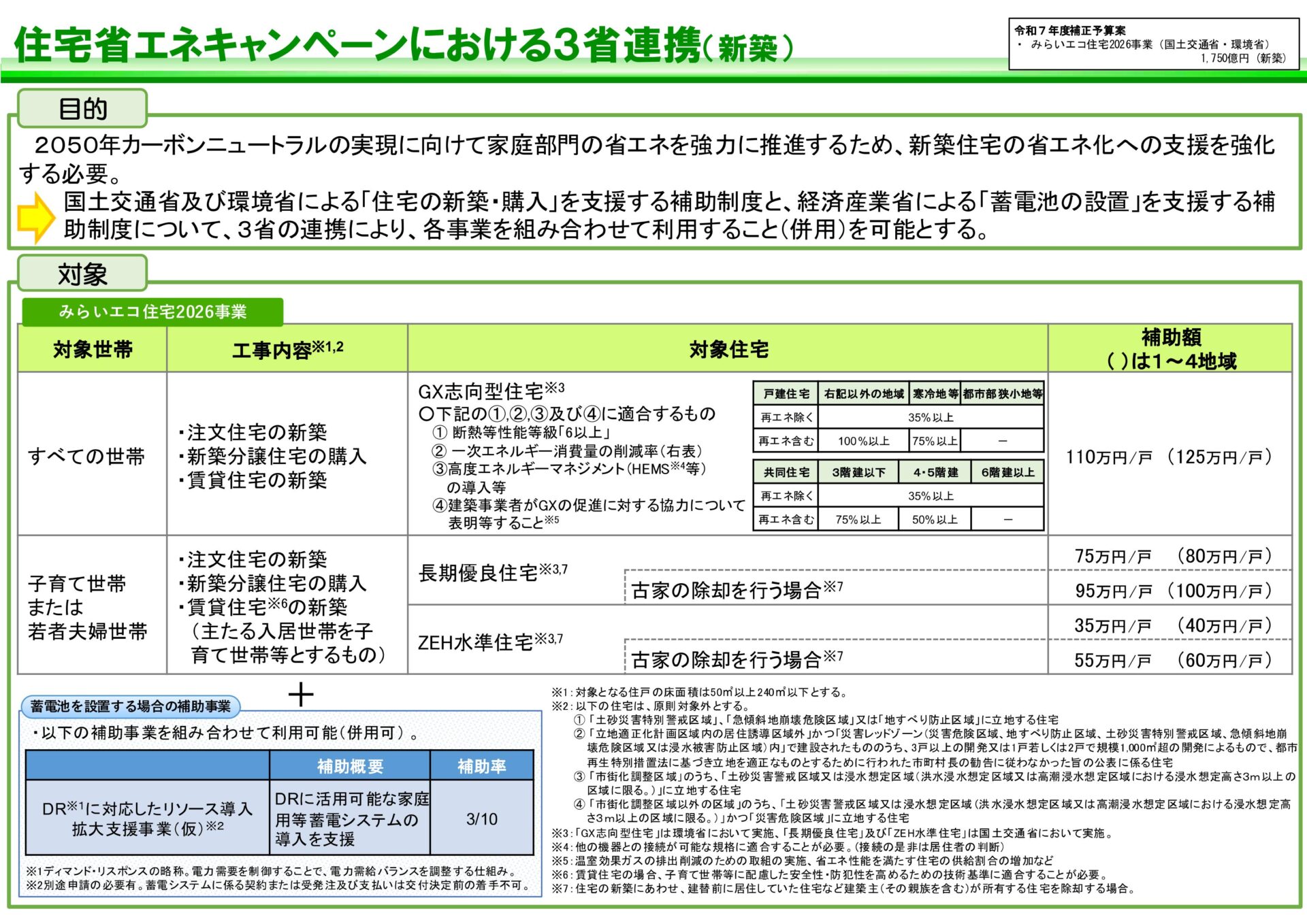 本年度の補正予算も成立し、2025年から変更はありますが来年も大枠は継続されるようです。既に公表されている2026年の住宅に関する補助金の概要をご紹介いたします。